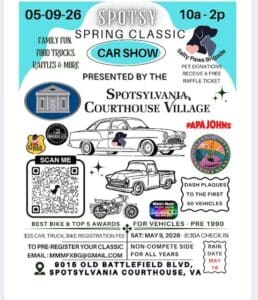 Spotsylvania Spring Classic Car Show. 5/9/26, 10 am – 2 pm